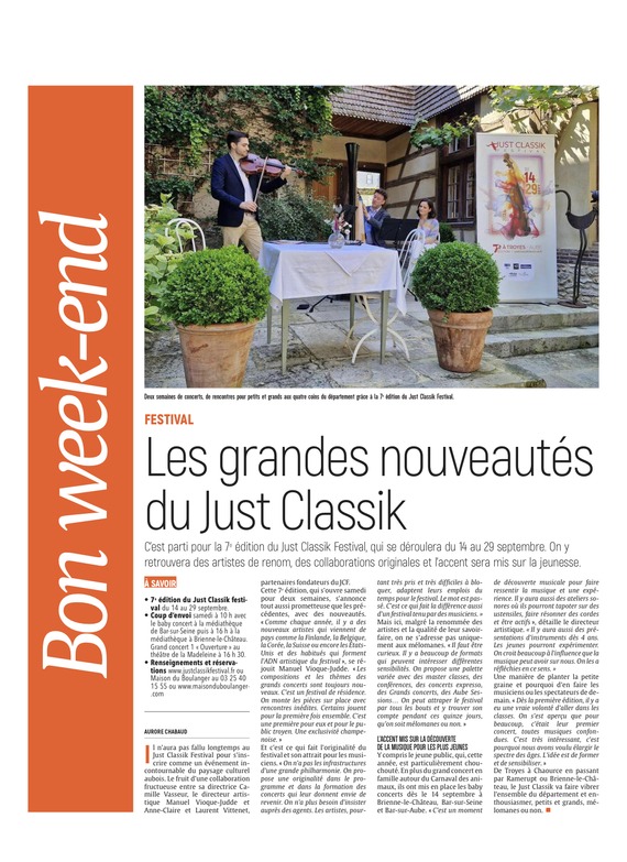 C’est parti pour la 7e édition du Just Classik Festival, qui se déroulera du 14 au 29 septembre. On y retrouvera des artistes de renom, des collaborations originales et l’accent sera mis sur la jeunesse.